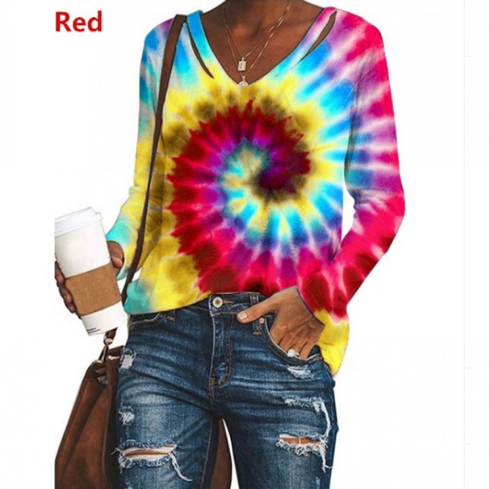 New Women's V-Neck Tie-Dye Printing Long-Sleeved Loose Top T-Shirt