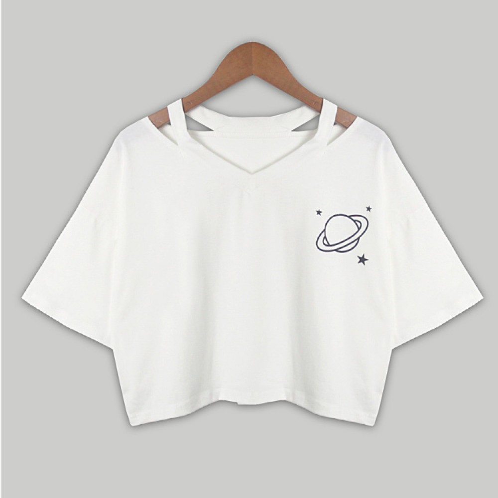 V-Neck Hollow Planet Print Short T-Shirt